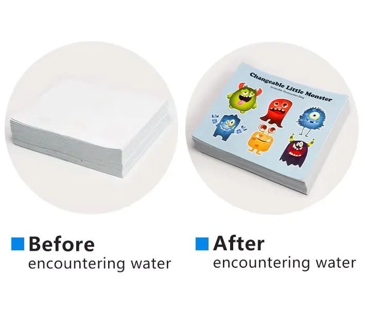 Wanneer het in water wordt ondergedompeld, verandert het onmiddellijk in een pasta-achtige toestand en verspreidt het zich snel. De erop gedrukte kleuren verspreiden zich vervolgens en vervormen dienovereenkomstig. Het kleurveranderingsproces is onomkeerbaar. Eenmaal blootgesteld aan water, zal het de kleur permanent weergeven.