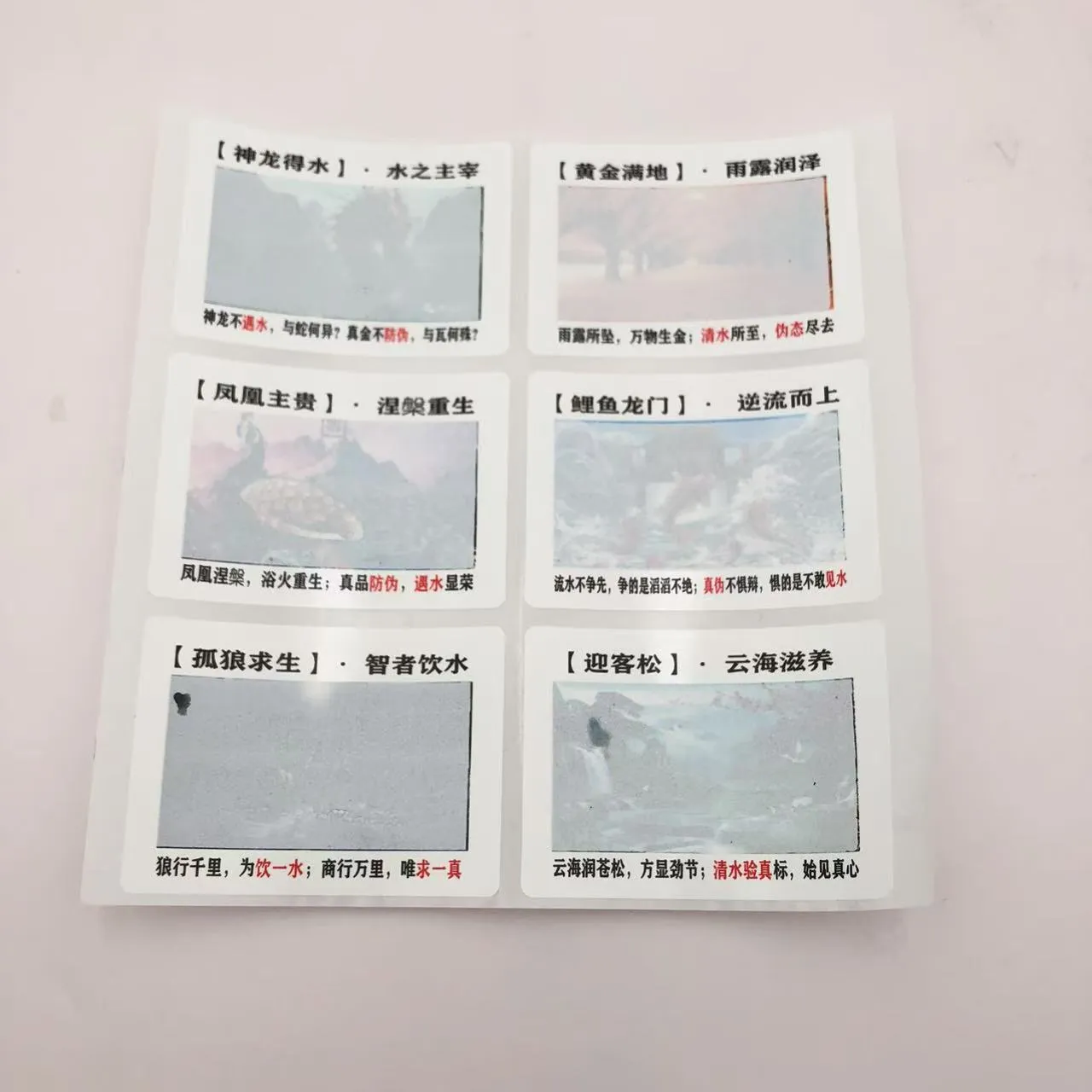 Watergevoelige labels met kleurverandering maken gebruik van fysische of chemische reacties tussen de inkt en het water om verborgen patronen zichtbaar te maken of kleurveranderingen teweeg te brengen. Deze labels zijn geproduceerd met gespecialiseerde processen en apparatuur en bieden uitstekende anti-namaakeigenschappen. Bepaalde soorten kunnen na het drogen terugkeren naar hun oorspronkelijke staat, waardoor herhaald gebruik mogelijk is.