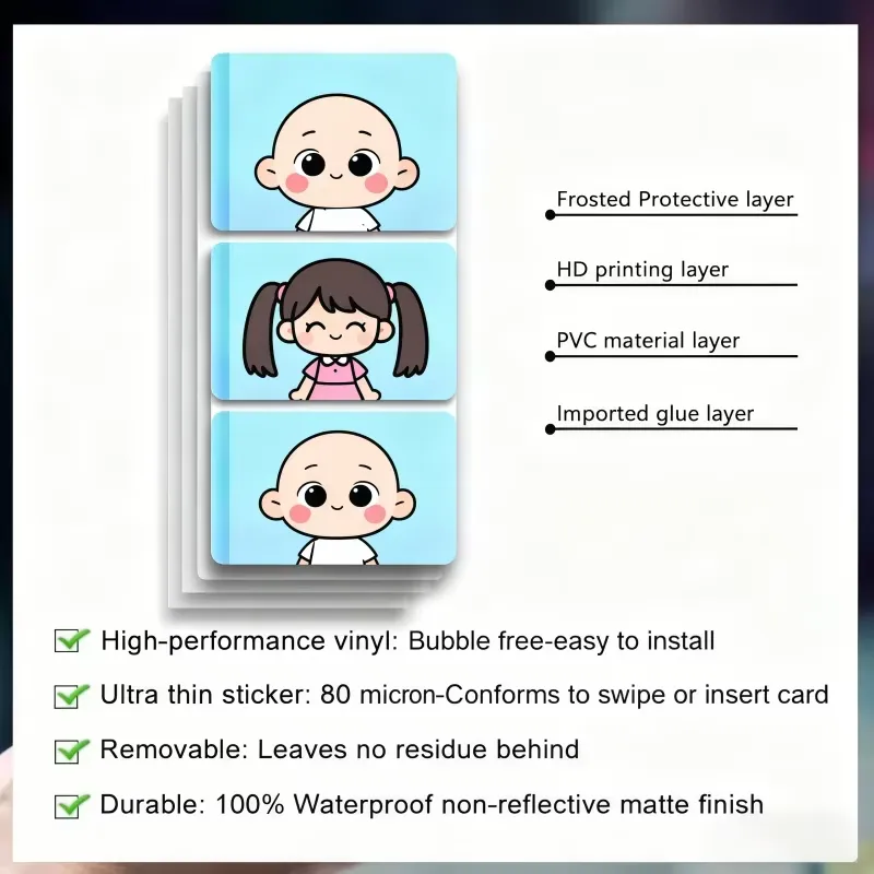 Creditcardhuid, meestal gemaakt van materialen zoals PVC-plastic, dat dun is, gemakkelijk te plakken en te verwijderen, en vaak een waterdicht en krasbestendig mat oppervlak heeft om duurzaamheid en een langdurig uiterlijk te garanderen. Het is waterdicht, scheurbestendig en compatibel met UV-printen met hoge resolutie.