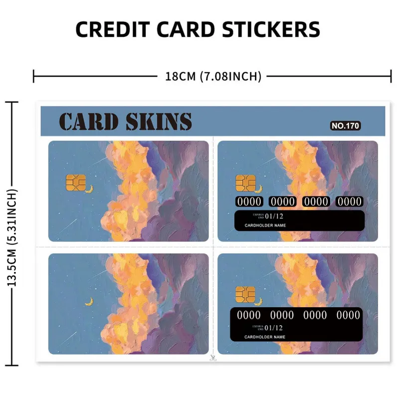 Creditcardstickerszijn gepersonaliseerde decoratieve stickers die kunnen worden geplakt op het oppervlak van creditcards. Ze zijn gemaakt van ultradunne en milieuvriendelijke materialen en hebben geen invloed op het normale vegen van de kaart of het lezen van de chip. Het stelt niet alleen creditcards in staat om een unieke stijl te presenteren, maar sommige producten hebben ook praktische functies zoals anti-swipe (RFID-blokkering) en tegelijkertijd ondersteuning van logo-aanpassing. Het is een product dat schoonheid en bruikbaarheid combineert.