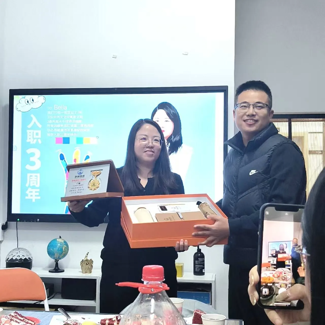 Als geweldige verrassing overhandigde baas Gao ook persoonlijk prachtige werkjubileumcadeaus aan Tom en Ella, en manager Bella. Deze speciale tokens zijn een oprechte erkenning van hun bijdragen in de afgelopen jaren en dragen onze beste wensen voor voor hun voortdurende groei binnen het bedrijf.