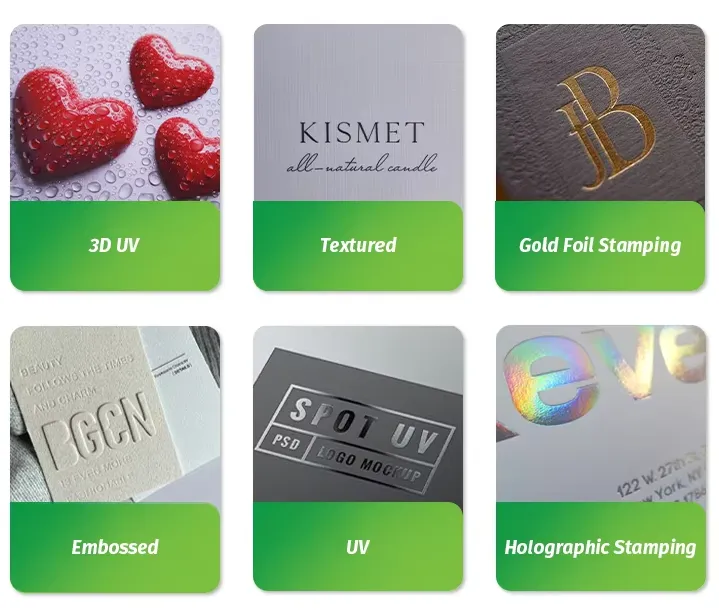 Embossing: Creëert verhoogde, driedimensionale patronen of tekst op de geurkaarslabels. Het voegt textuur en een tastbaar element toe, waardoor de geurkaarslabels aantrekkelijker worden om aan te raken. Embossing werkt goed met logo's of decoratieve motieven, waardoor het premium gevoel wordt versterkt.